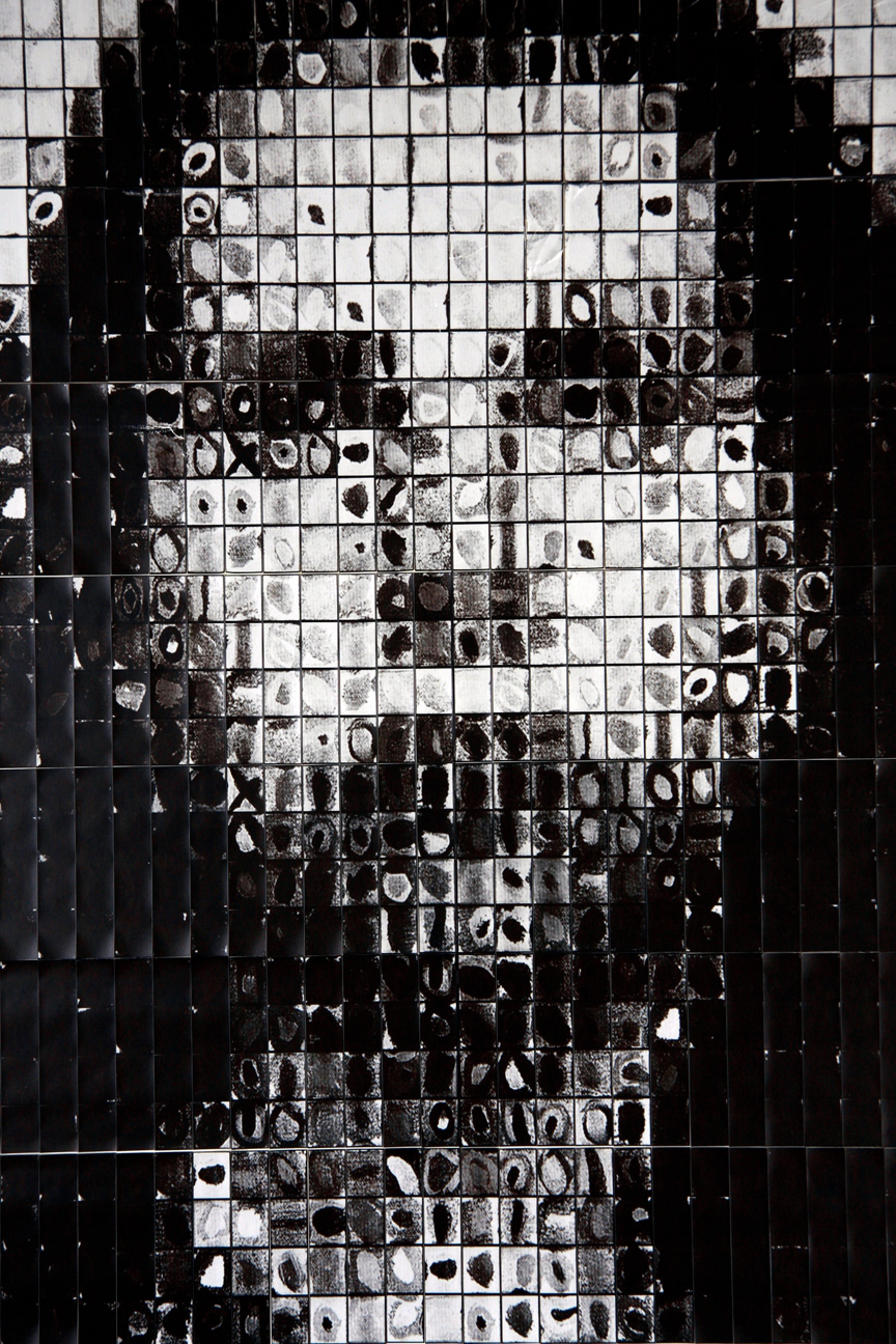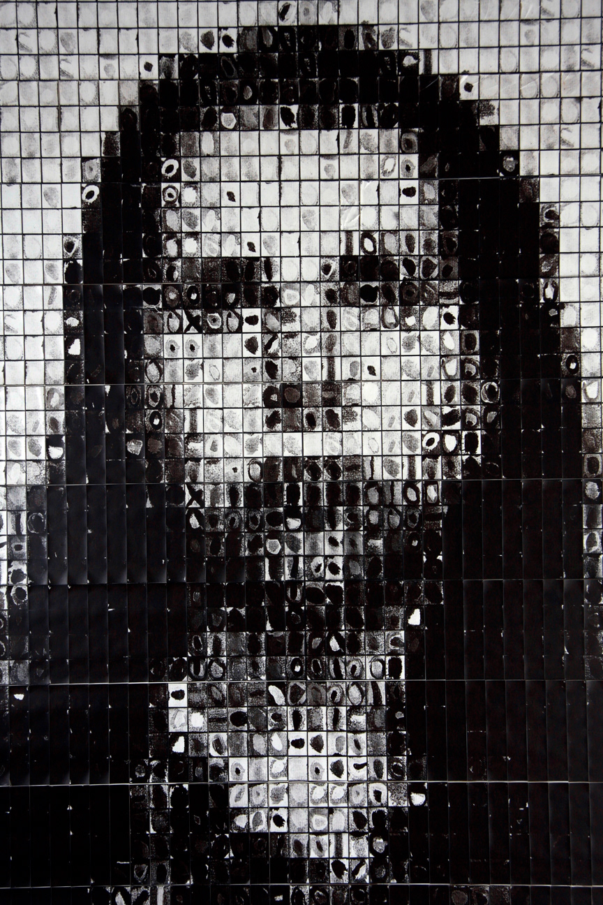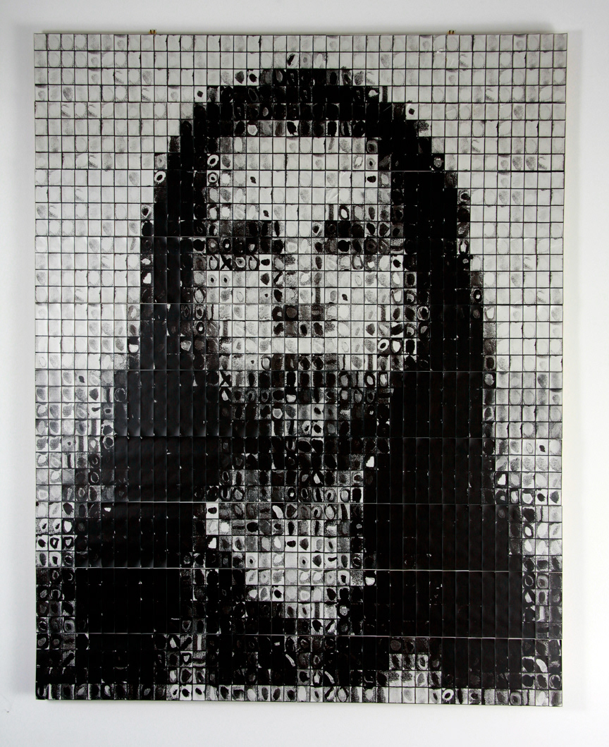 45" x 80" - Collage comprised of 400 uncut photostrips. A literal homage to Chuck Close - literal in that each frame is a photograph of a square from one of Chuck Close's paintings. The borrowed squares were rotated and rearranged to approximate a portrait of my wife, Heather, then photographed one by one in a vintage photobooth.