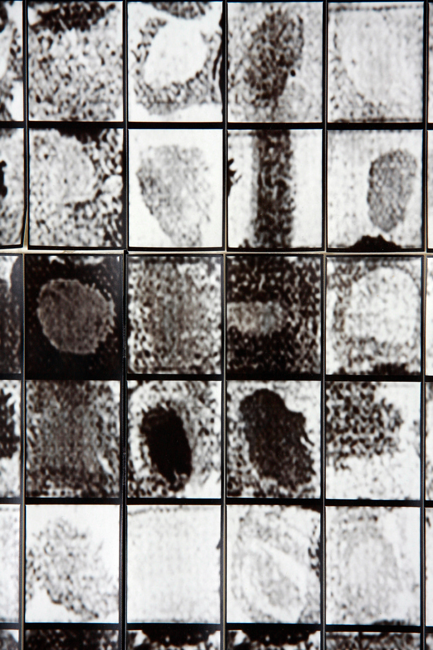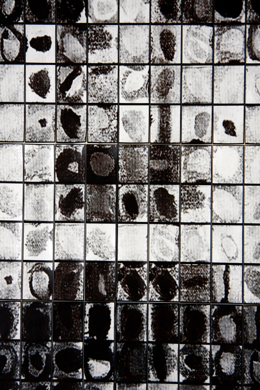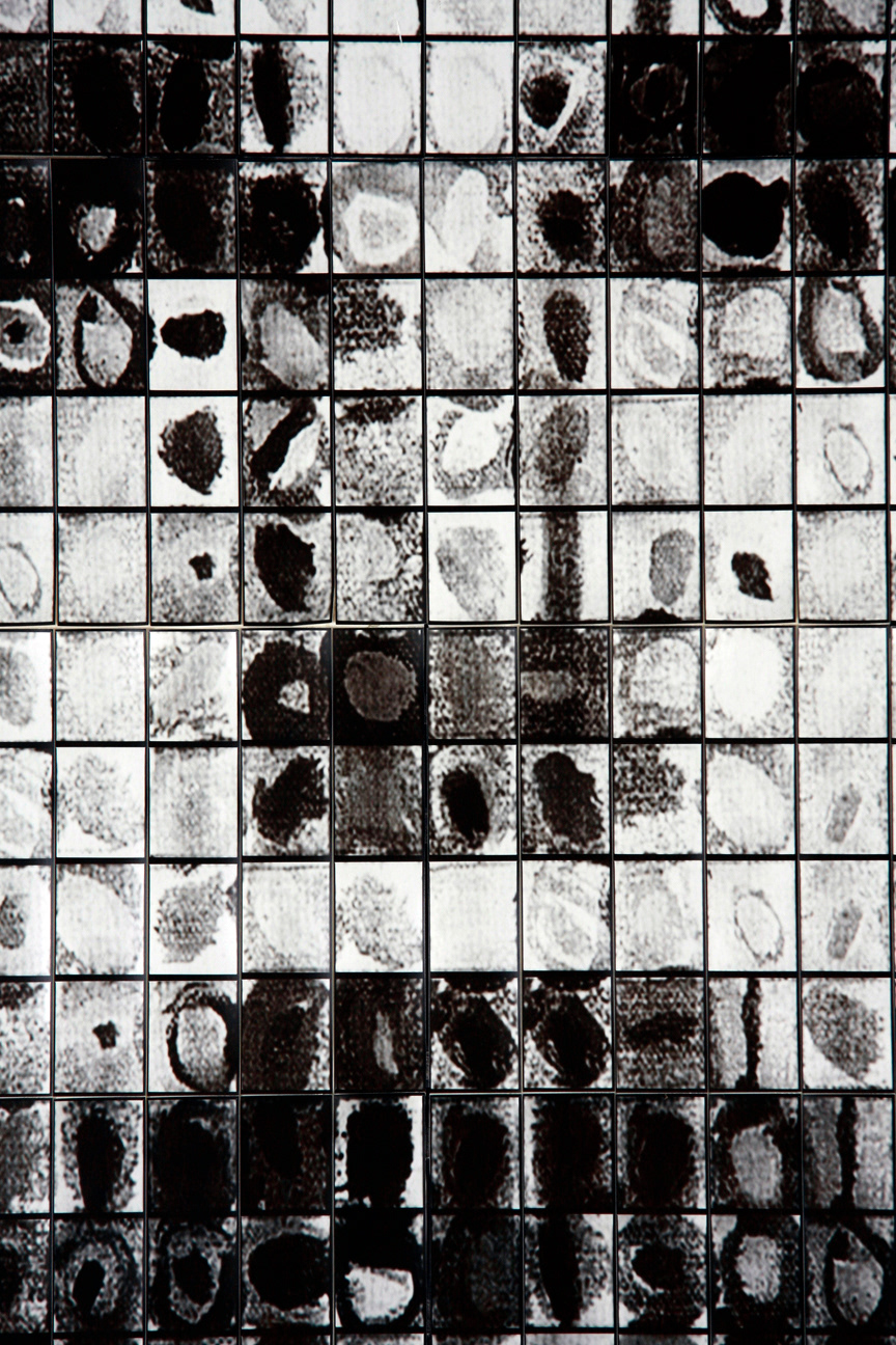 45" x 80" - Collage comprised of 400 uncut photostrips. A literal homage to Chuck Close - literal in that each frame is a photograph of a square from one of Chuck Close's paintings. The borrowed squares were rotated and rearranged to approximate a portrait of my wife, Heather, then photographed one by one in a vintage photobooth.