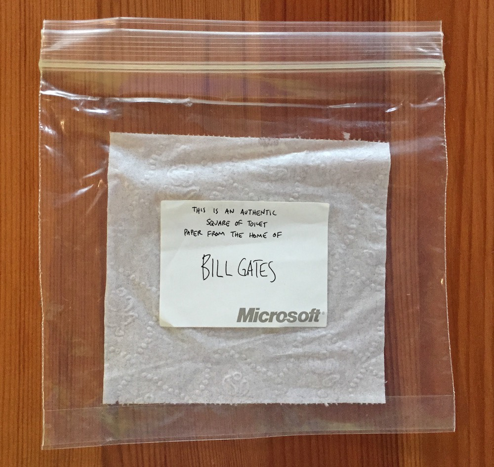 The challenge: to procure a souvenir from the home of Bill Gates that was perfectly legal and would not be missed, using means that were non-destructive. The solution: a square of toilet paper (2-ply, natch). Co-conspirator: Kaya Bekiroglu